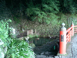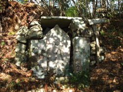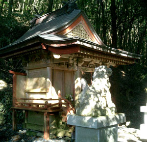 本宮大社下の庁舎(役場)の裏、音無川に沿って1qほど上ると右に前に広場のある製材所がある。その50m程手前左側にわかりにくいが柱に書かれた標柱が立っている。そこから小さな谷沿いに100mほど上ると左側に鎮座?している。