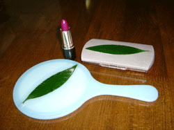ナギの葉は、縦には簡単に裂くことができますが、横には枯れ葉であってもちぎり切ることができない。コゾウナカセ、チカラシバなどの別名があるほどじょうぶである。その丈夫さにあやかって、男女の仲を結び付ける力も強いと信じられ、昔の女人は鏡の底にナギの葉をいれ、夫婦の縁が切れないよう、離れていても忘れぬようにと願う習慣があったそうだ。平成のご婦人方も平安時代の女人にならい、手鏡やコンパクトに張り付け楽しまれてはいかがでしょうか。